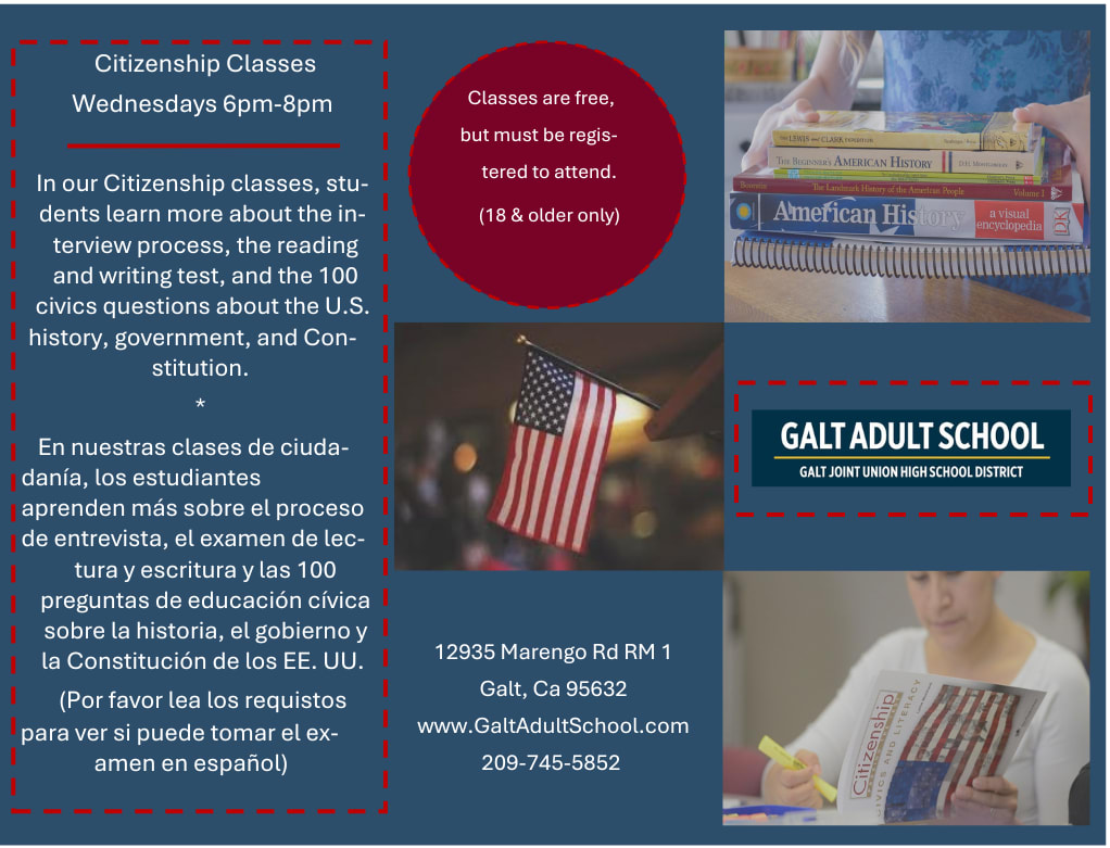 Join Galt Adult School in their Citizenship classes. Where students will learn more about the interview process, the reading and writing test, and the 100 civics questions about the U.S. history, government, and Constitution. Register at www.GaltAdultSchool.comImages