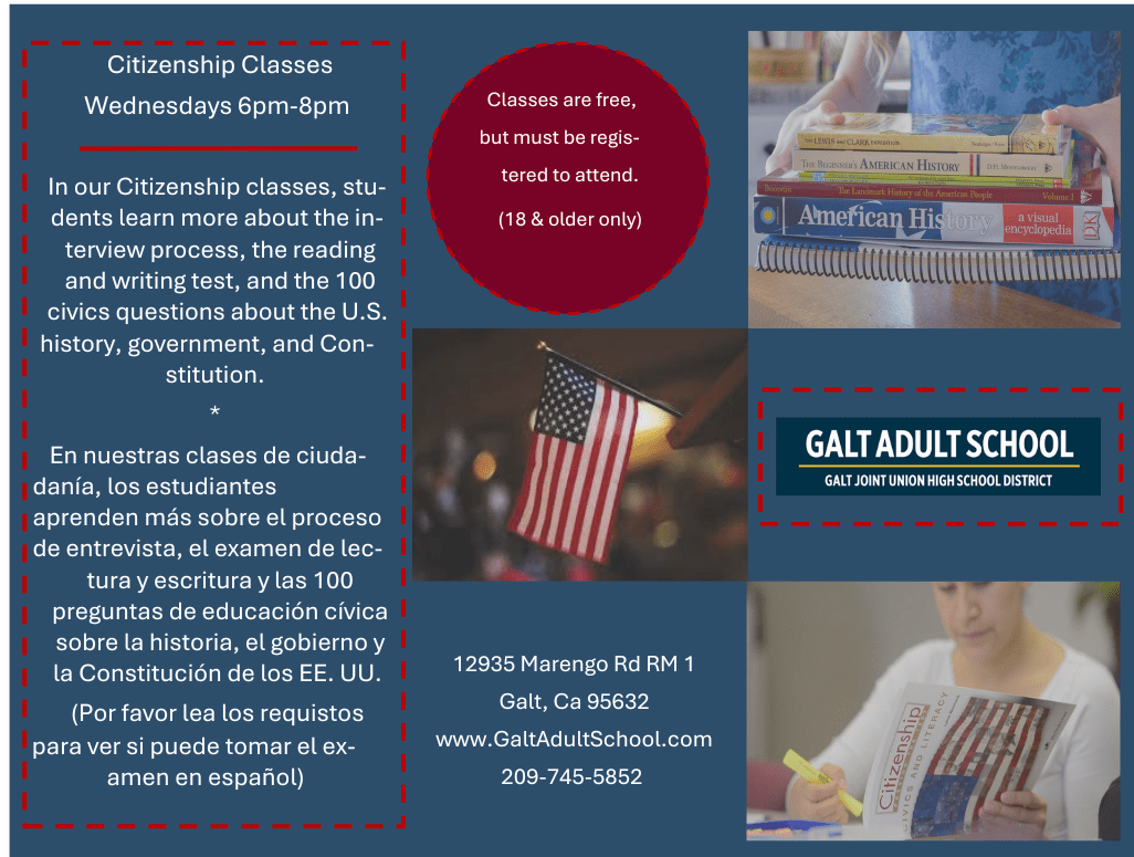Join Galt Adult School in their Citizenship classes. Where students will learn more about the interview process, the reading and writing test, and the 100 civics questions about the U.S. history, government, and Constitution. Register at www.GaltAdultSchool.comImages
