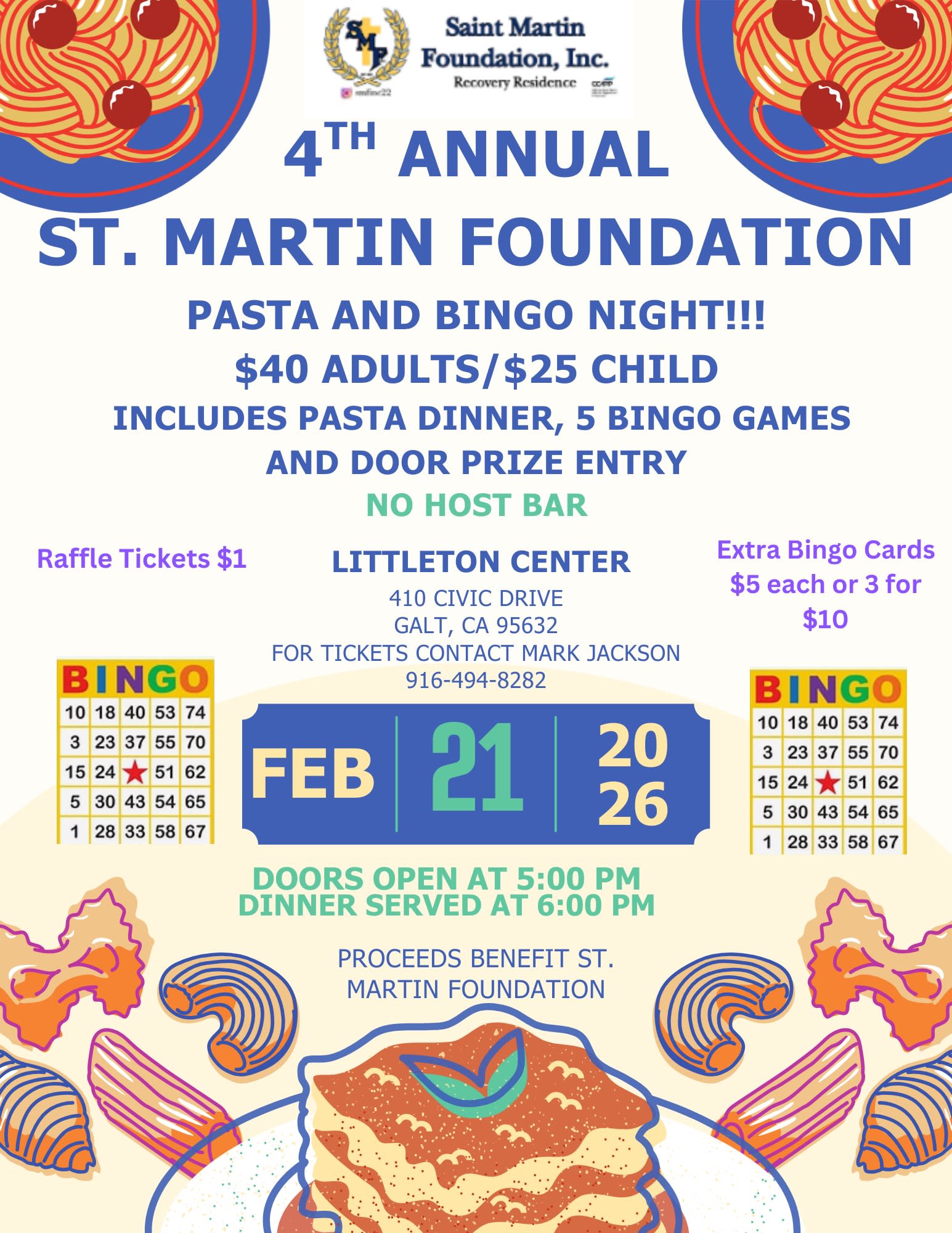 Join the Saint Martin Foundation for the 4th Annual Pasta and Bingo night! $40 adults and $25 child Includes Pasta dinner, 5 Bingo Games, and Door prize entryImages