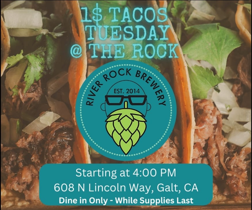 It's Taco Tuesday! Come join River Rock Brewery for 1$ Tacos starting at 4:00PM (Dine in Only - While Supplies Last). 608 N. Lincoln Way Galt, CA 95632Images
